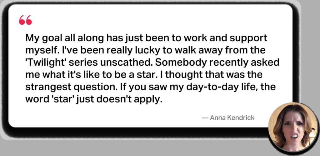 Anna Kendrick’s net worth of $20 million comprises her earnings from successful films and her singing career. Her lead role in Pitch Perfect was significant in her fortune, with global earnings of over $115 million on a $17 million budget.