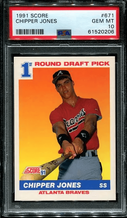 The 1991 Score Chipper Jones rookie card may not look like much at first, but it’s actually the most affordable Chipper Jones rookie card out there. With over 5,200 graded copies and a price ranging from a measly $1.30 for an ungraded version to $45.50 for one in gem mint condition, this card is perfect for any budget.