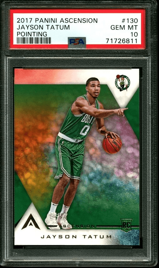 The 2017 Panini Ascension Jayson Tatum Rookie Card #130 offers a vibrant, middle-level release featuring dual cards with the same number. Its colorful design and accessibility make it a coveted piece of memorabilia. Prices range from $11 to $199, but a gem mint fetched $300 in September 2022—an all-time high.