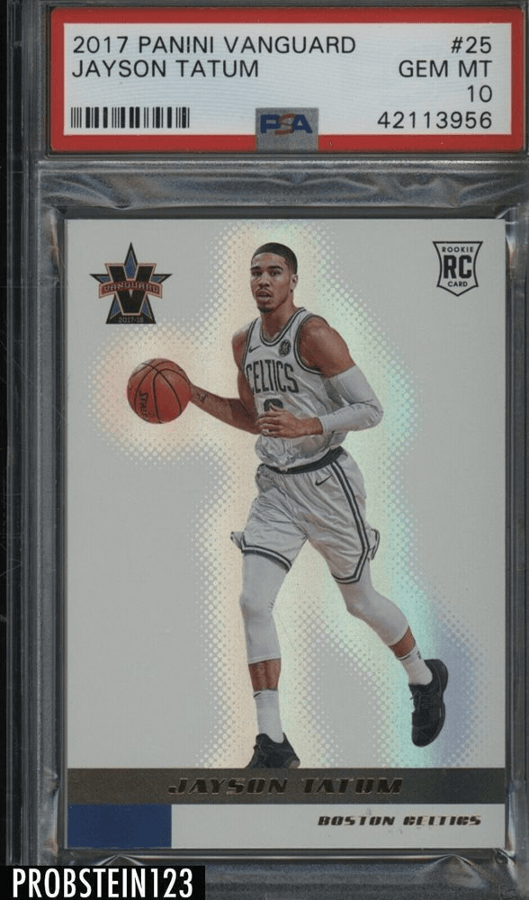 The 2017 Panini Vanguard Jayson Tatum Rookie Card #25 stands out with its minimalist white space and extremely limited availability.