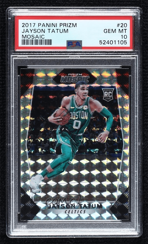 The 2017 Panini Mosaic Prizm Jayson Tatum #20 rookie card has an appealing look with interesting color parallels.