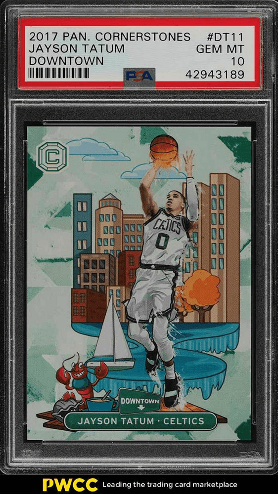 Featuring a distinctive artistic design, the 2017 Panini Cornerstones Downtown Jayson Tatum #DT11 is a relatively rare basketball insert that has seen its value soar since it first hit the market.