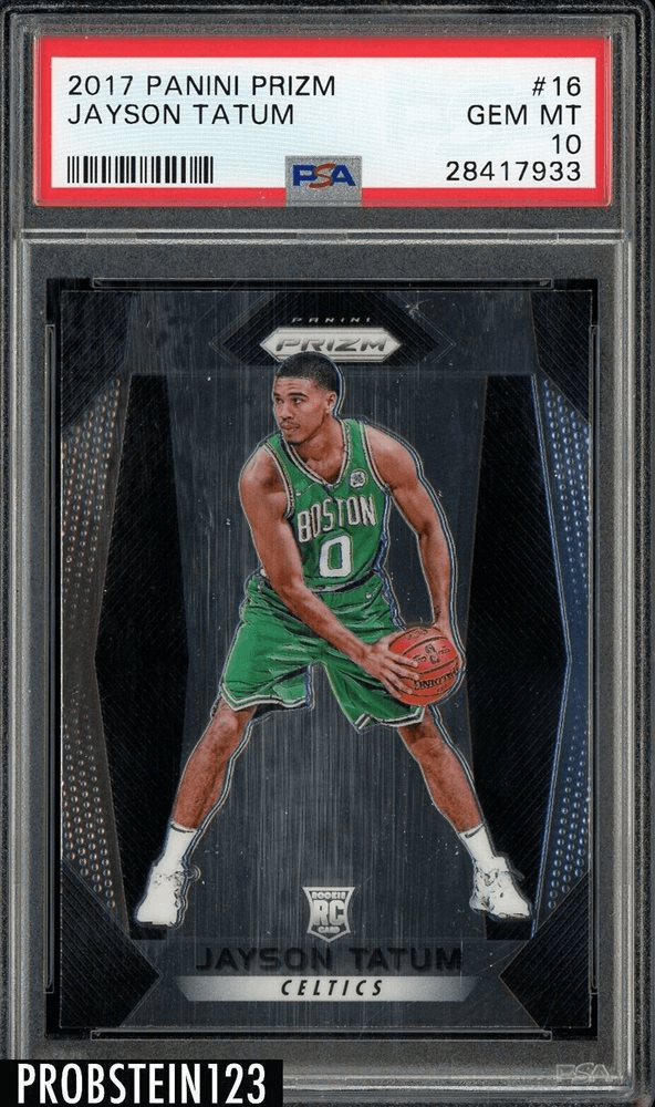 The 2017 Panini Prizm Jayson Tatum Rookie Card #16 is a choice for collectors looking for an affordable chrome collectible. With 6,089 gem mint copies in circulation and prices ranging from $26 to $205.