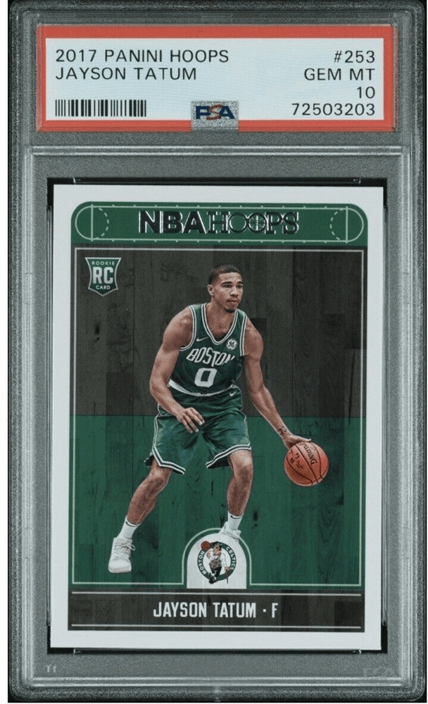 The 2017 Hoops Jayson Tatum Rookie Card #253 is a widely available rookie with a PSA gem mint supply of nearly 5,000 copies. While that’s quite high, the Tatum #253 card still piques collectors’ interest.