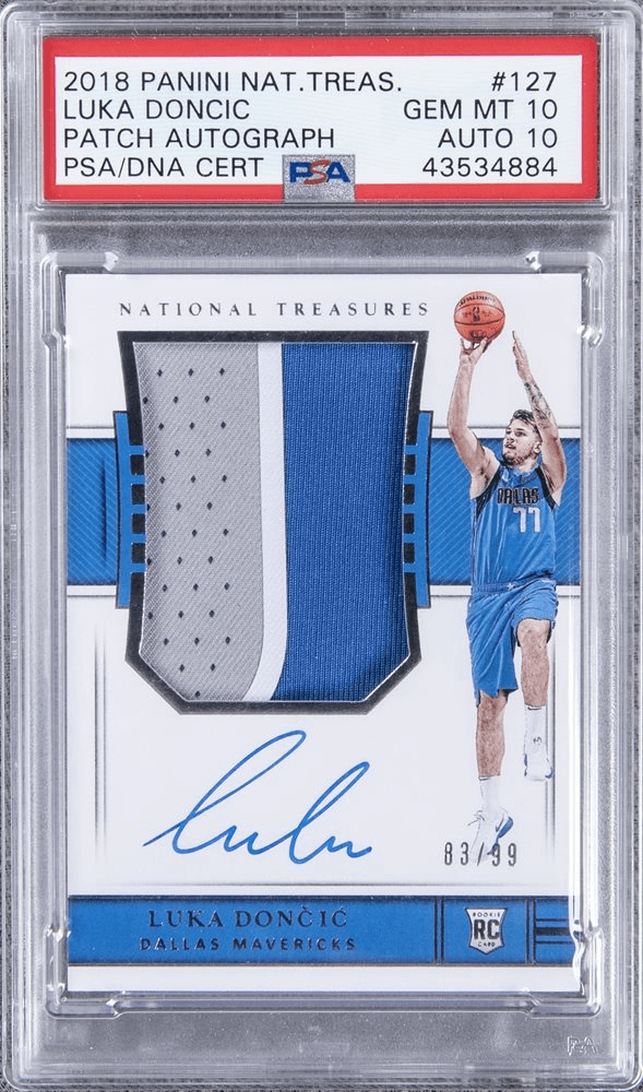 The 2018 Panini National Treasures Luka Dončić Auto Patch #127 is his most expensive basketball card, reaching $584,000 at a Goldin auction. It’s also the only card to feature both a jumbo patch and an on-card signature from Luka.