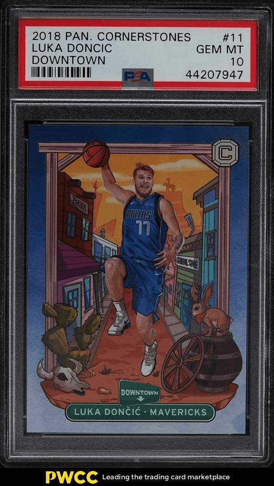 The 2018 Panini Cornerstones Downtown Luka Dončić RC #11 depicts the young star as a video-gamey cartoon. Only 44 PSA 10 copies were graded as of May 2023, and the card commands a premium, with market prices ranging from $5,100 to $7,300—we’ve seen the highest price for this card breach $15,000 in early 2021.