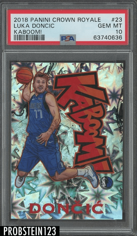 The 2018 Panini Crown Royale Kaboom Luka Dončić RC #23 features a unique comic book-style design that catches the eye. Its bold visuals, scarce print run, and rookie card status make it a unique card from the 2018-19 season, with prices ranging from a small $725 to a glamorous $21,600.