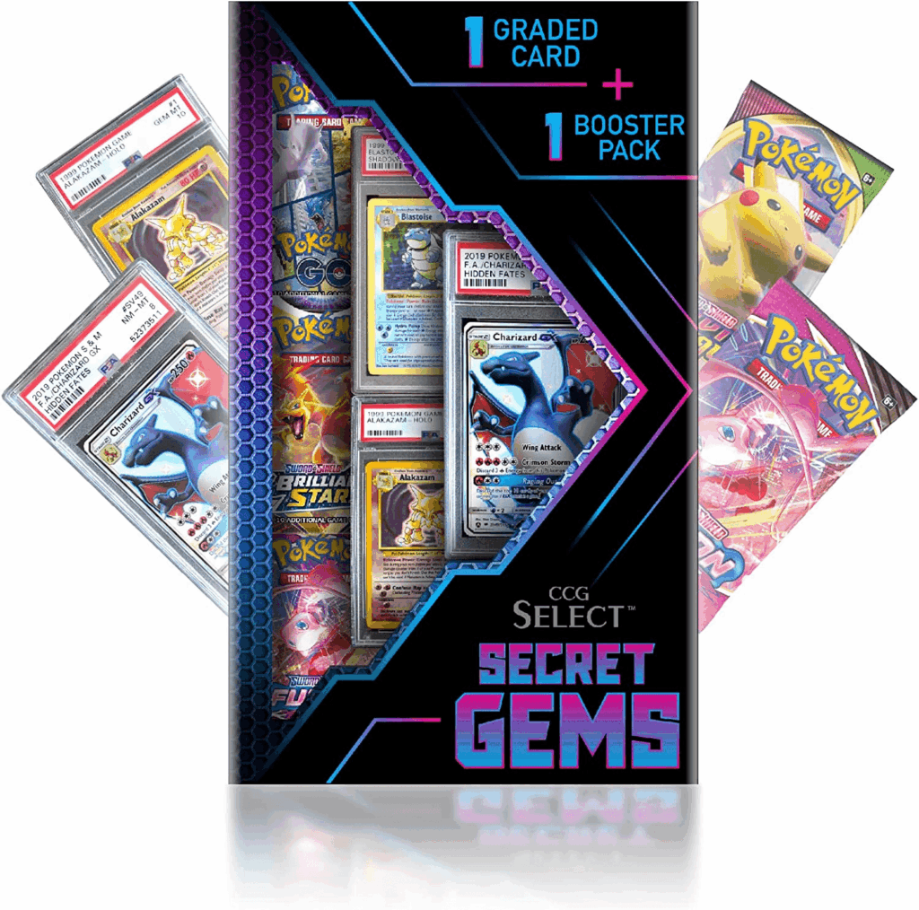 Next is the CCG Select Secret Gems mystery box, which you need to expand your collection. Priced at an affordable rate, this mystery box is an exciting box-opening experience that features one graded Pokemon card from BGS, CGC, or PSA and one Pokemon booster pack of any era—ranging from Sun and Moon to Sword and Shield or anything in between.