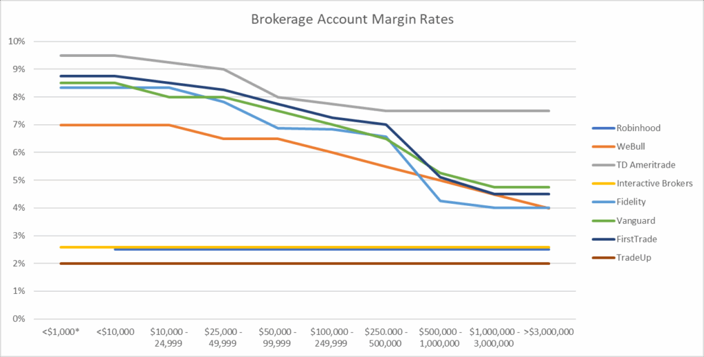 To better illustrate margin rates across different stock trading accounts, we graphed them side by side based on the most common margin ranges and rates charged per broker. TradeUp charged the lowest margin rates across the board while TD Ameritrade charged the highest.