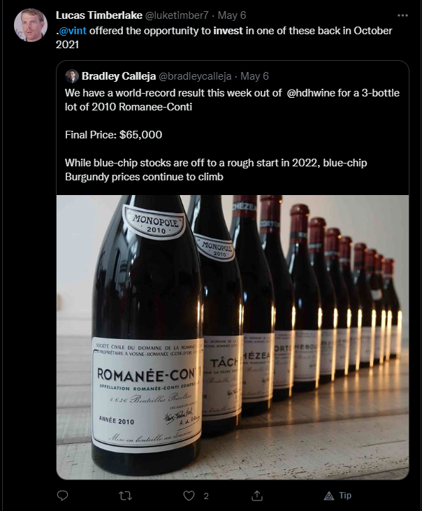 Lastly, Twitter user @luketimber7 observed after a three-bottle lot of 2010 Romanee-Conti sold for a record $65,000 that Vint had offered the opportunity to invest in the same wine seven months prior. He quoted a tweet by @bradleycalleja that read, “While blue-chip stocks are off to a rough start in 2022, blue-chip Burgundy prices continue to climb.”